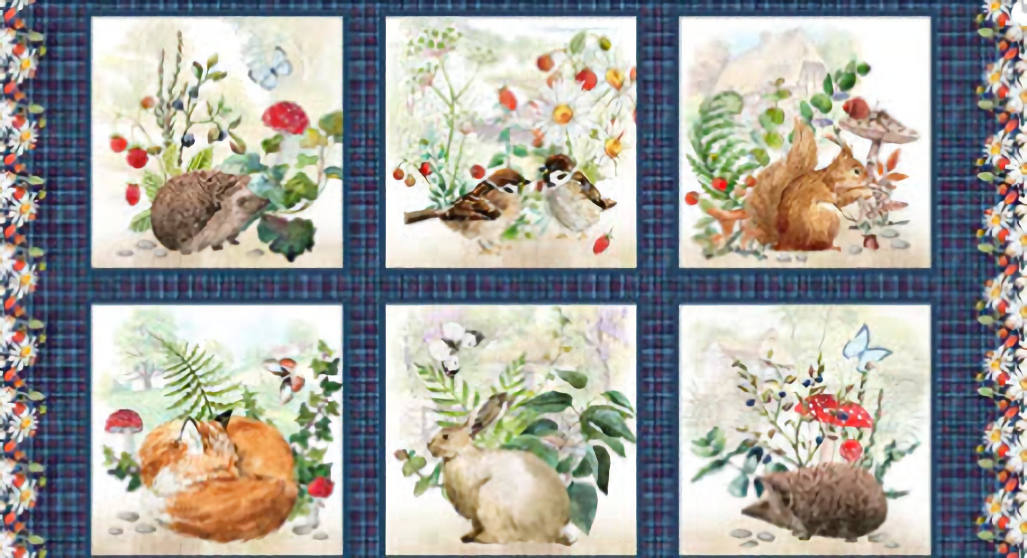 Bunny-fox-hedgehog-birdie with blue sky border is Hedgehog Hollow by Jason Yenter. Binding (by MSQC) used my supplied 1.5 yards of Kona Cotton Julep.