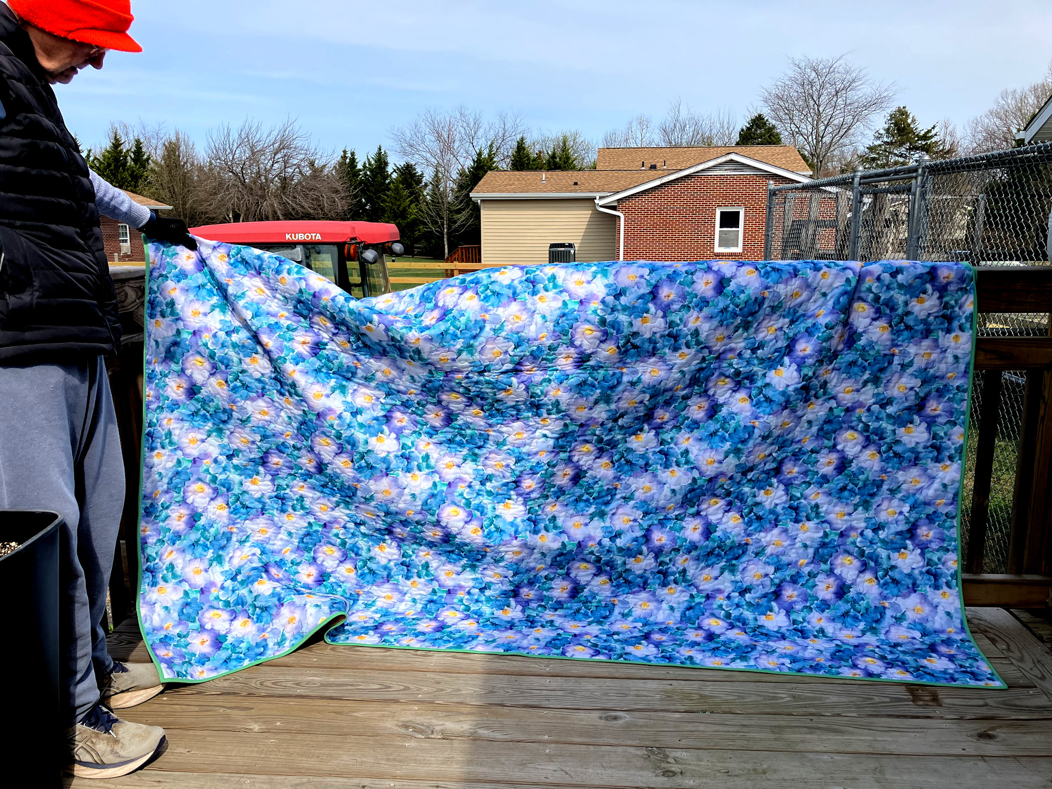 A 96-inch (across the front) square quilt seems best size for the sofa. I trimmed (before shipping to MSQC) the raw edges of this quilt to be 85-inches by 98-inches. Finished size (after MSQC binding) upon return from MSQC: 88- by 92-inches. MSQC quilting and binding: $341.40
