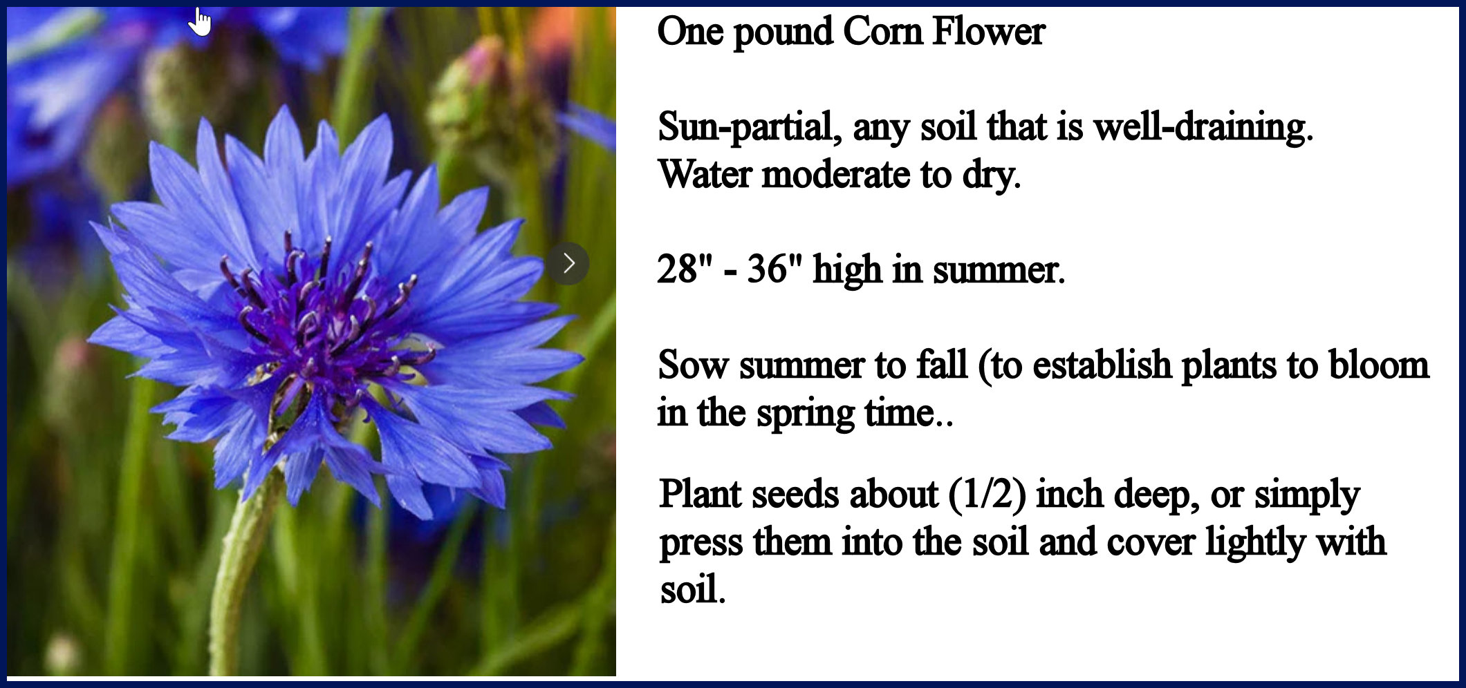 uarter pound Blue Flax Seeds Amer Meadows Oct 26, 2025One pound Blue Cornflower Amer Meads Oct 26, 2925