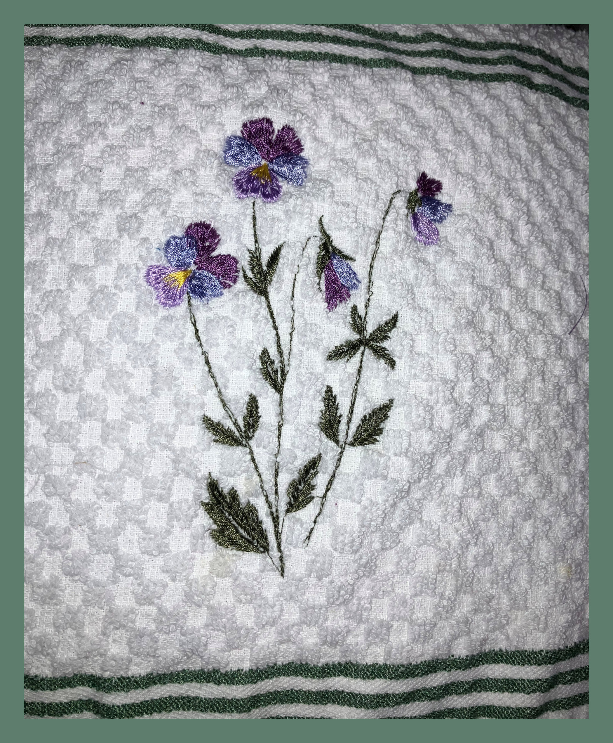 Pansy kitchen towel. 5×7, 7K stitches. From an Etsy wild flower bundle purchase.