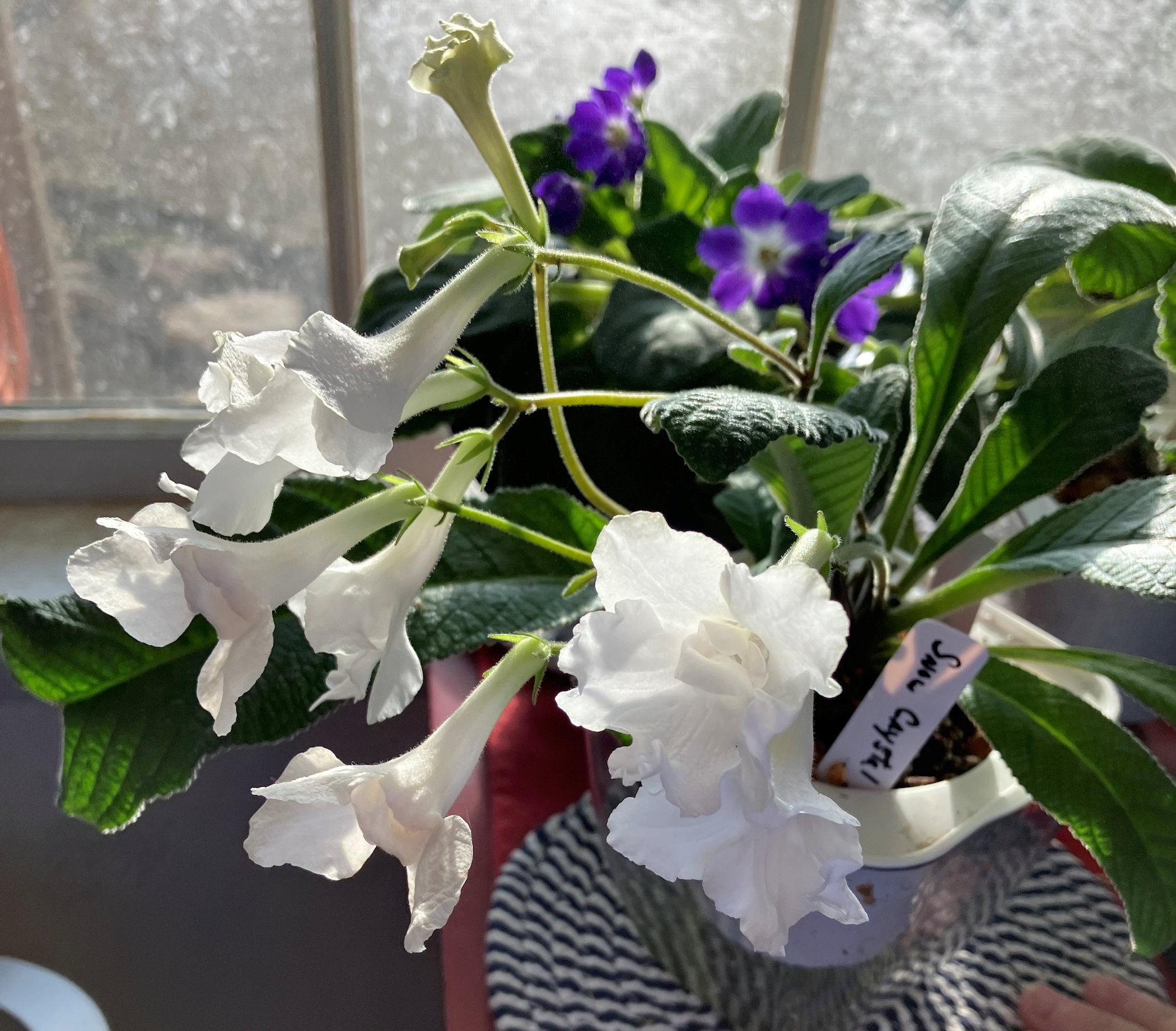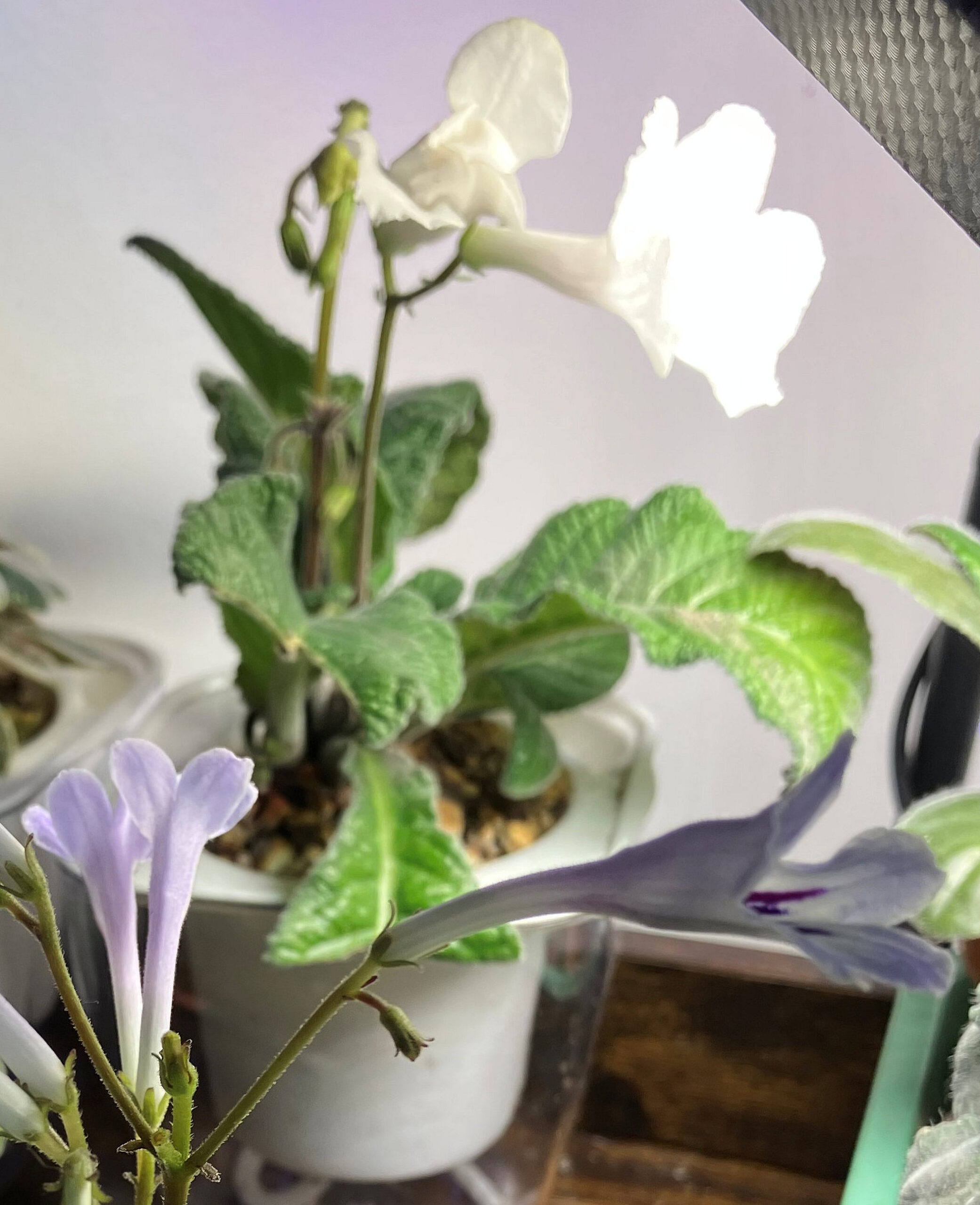 Bristol’s Indigo Eyes, Streptocarpus. Eye catching, large white blooms with large, dark, wine-purple throat. Good grower and excellent bloomer. Purchased June 15, 2025.