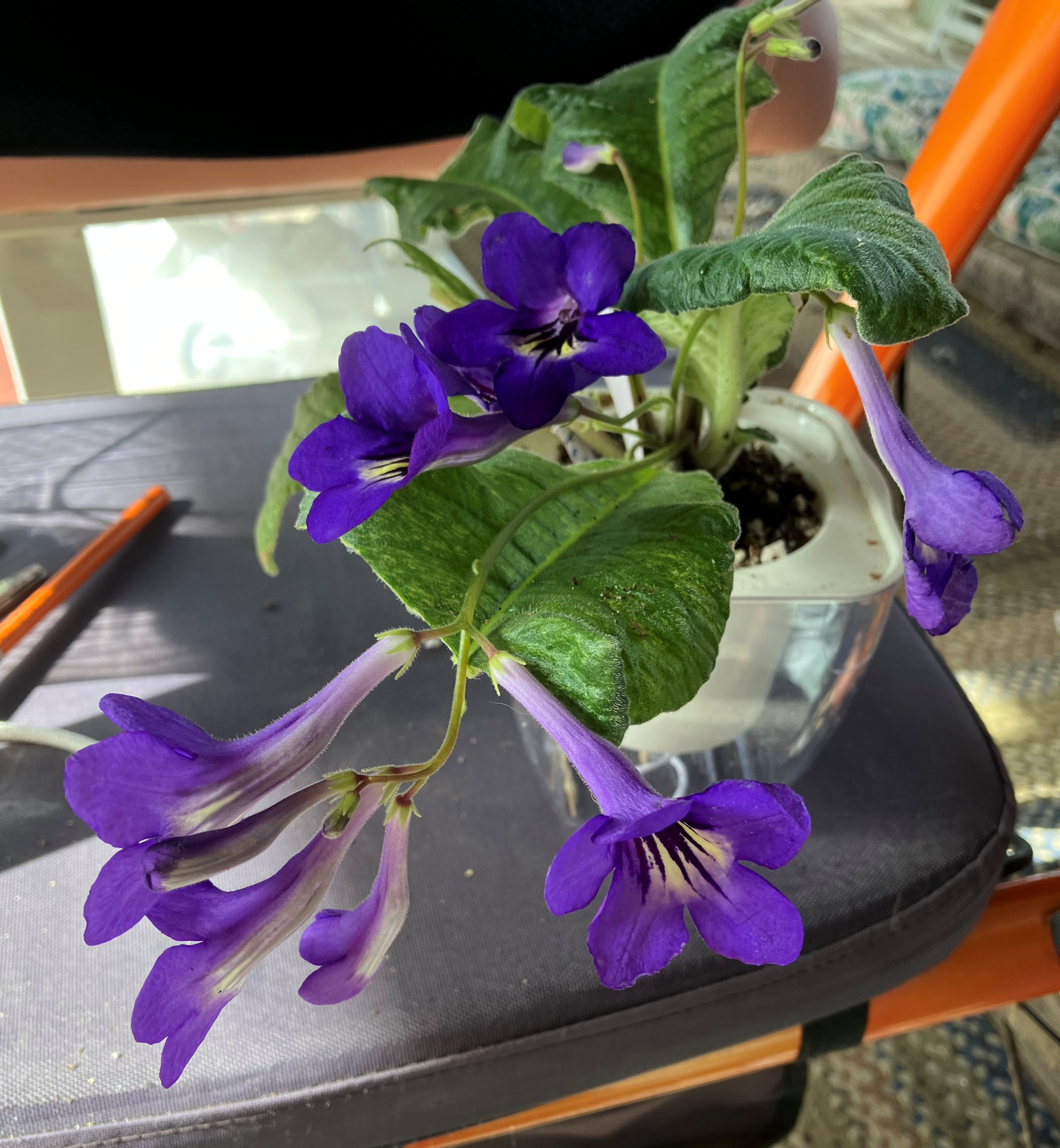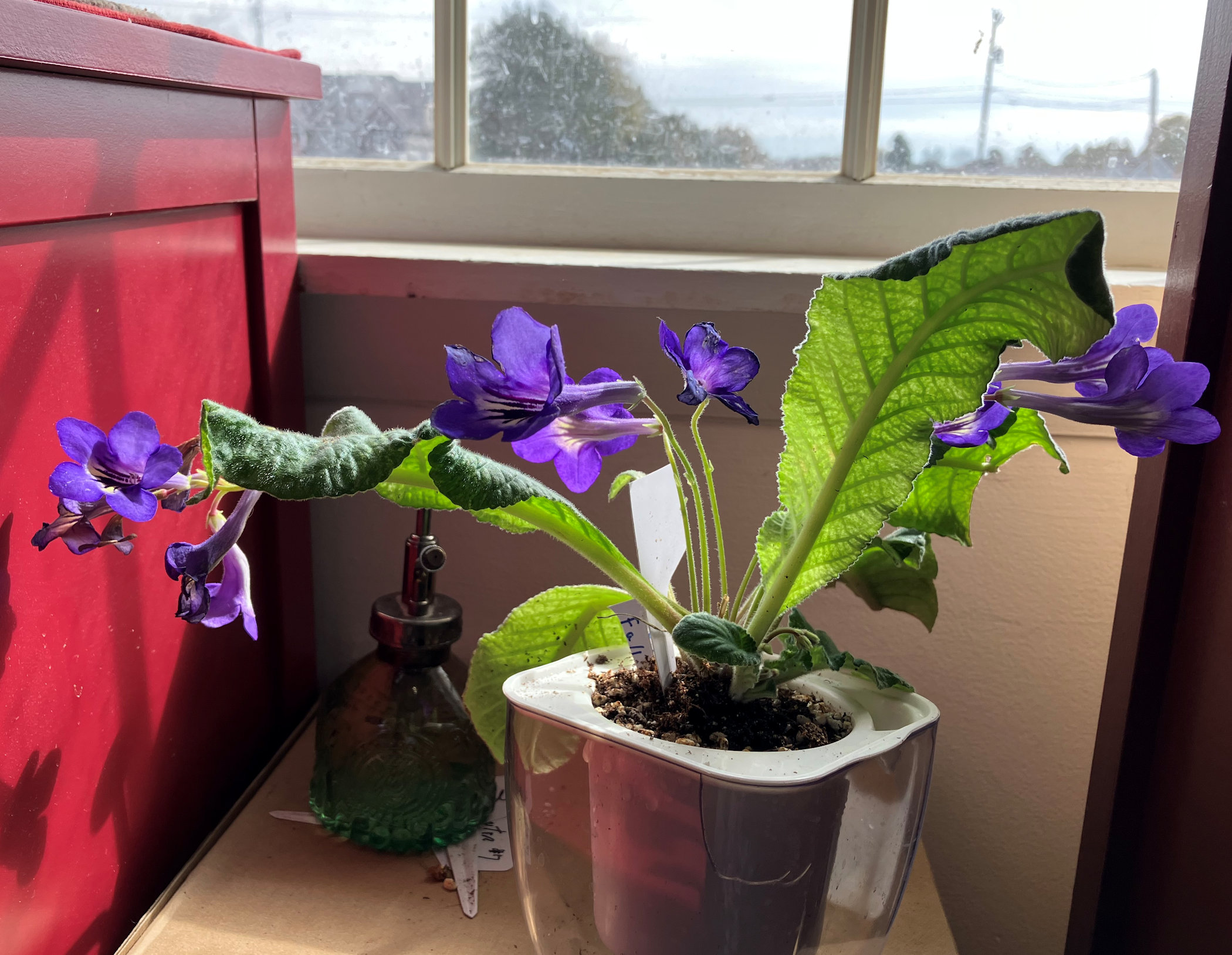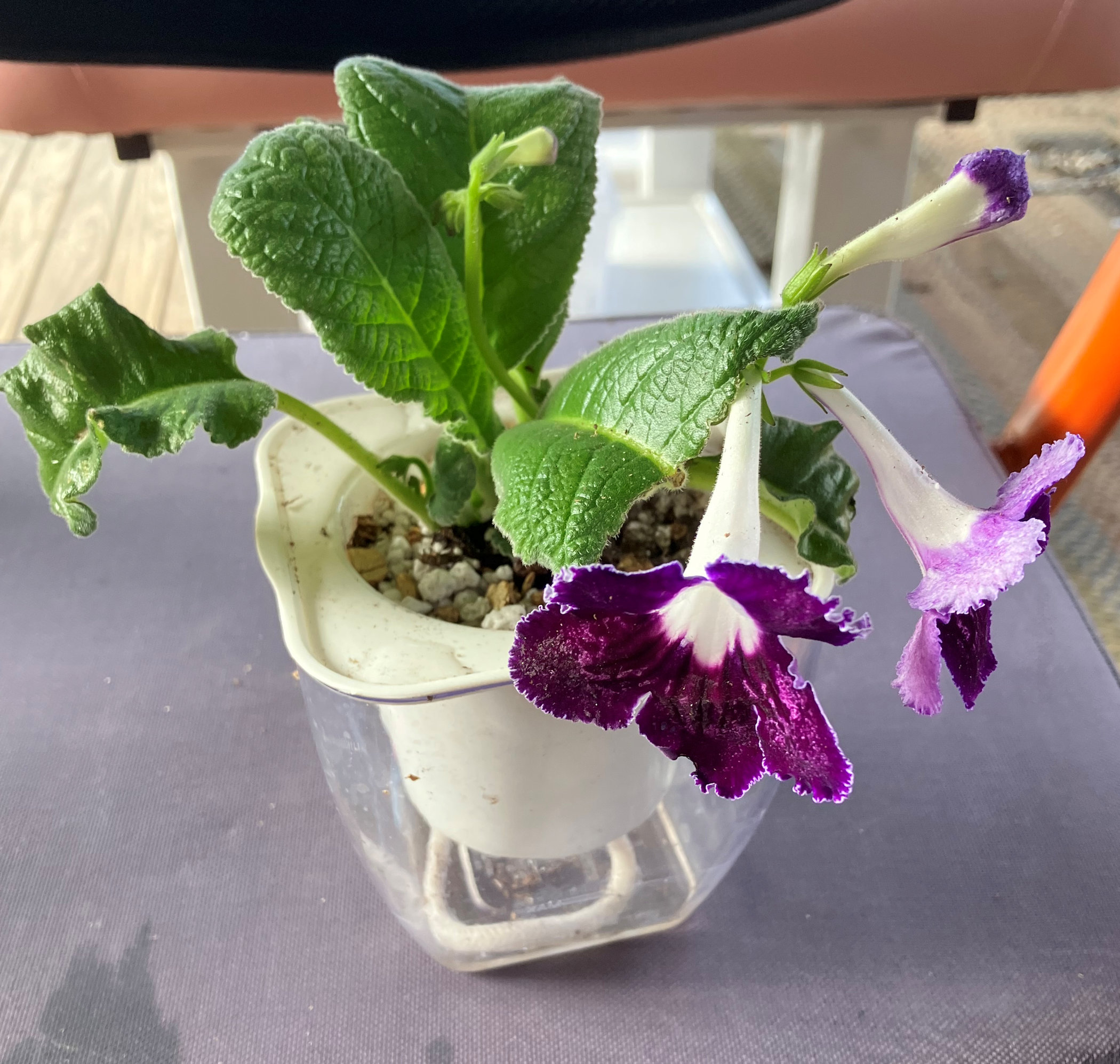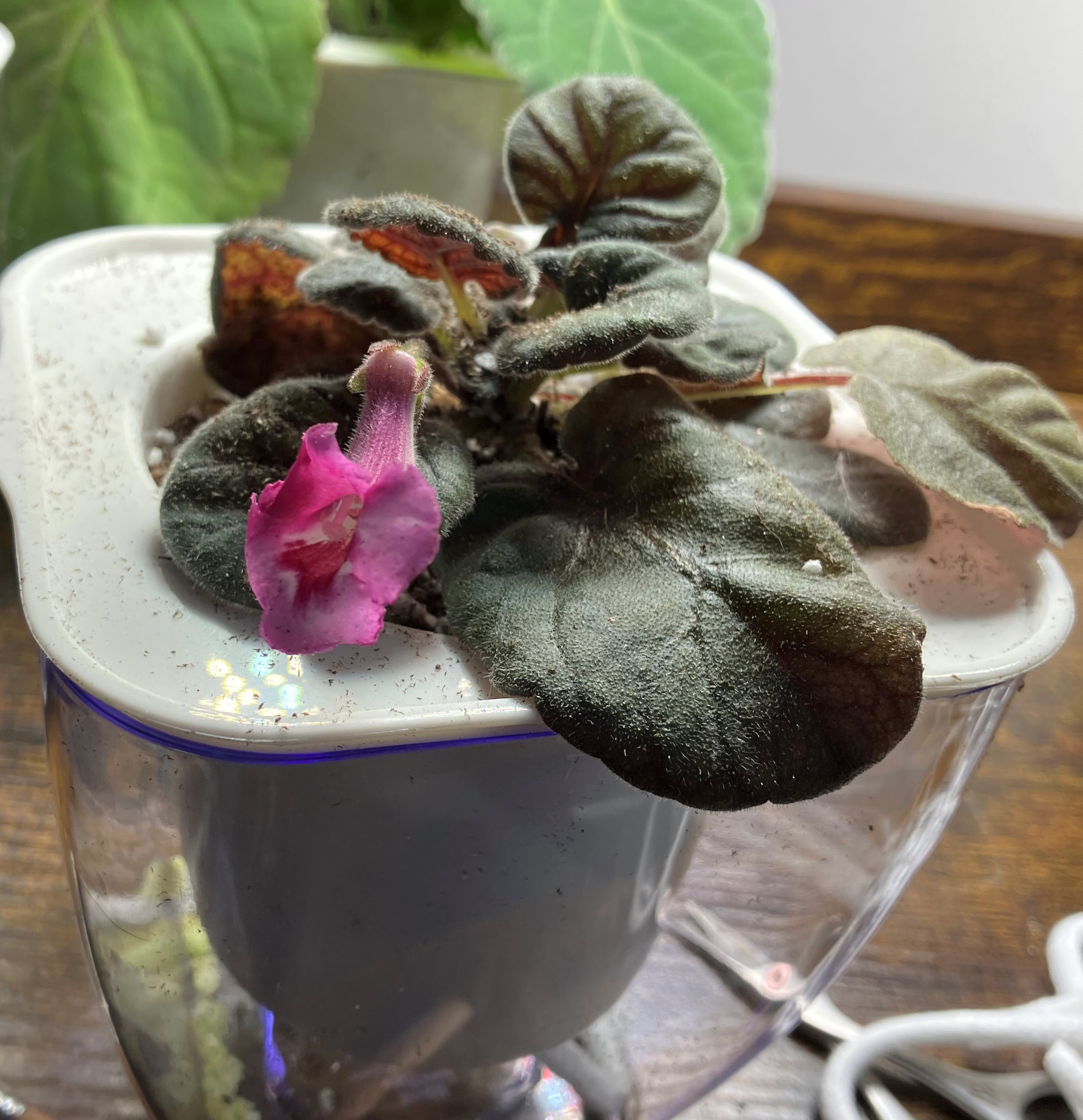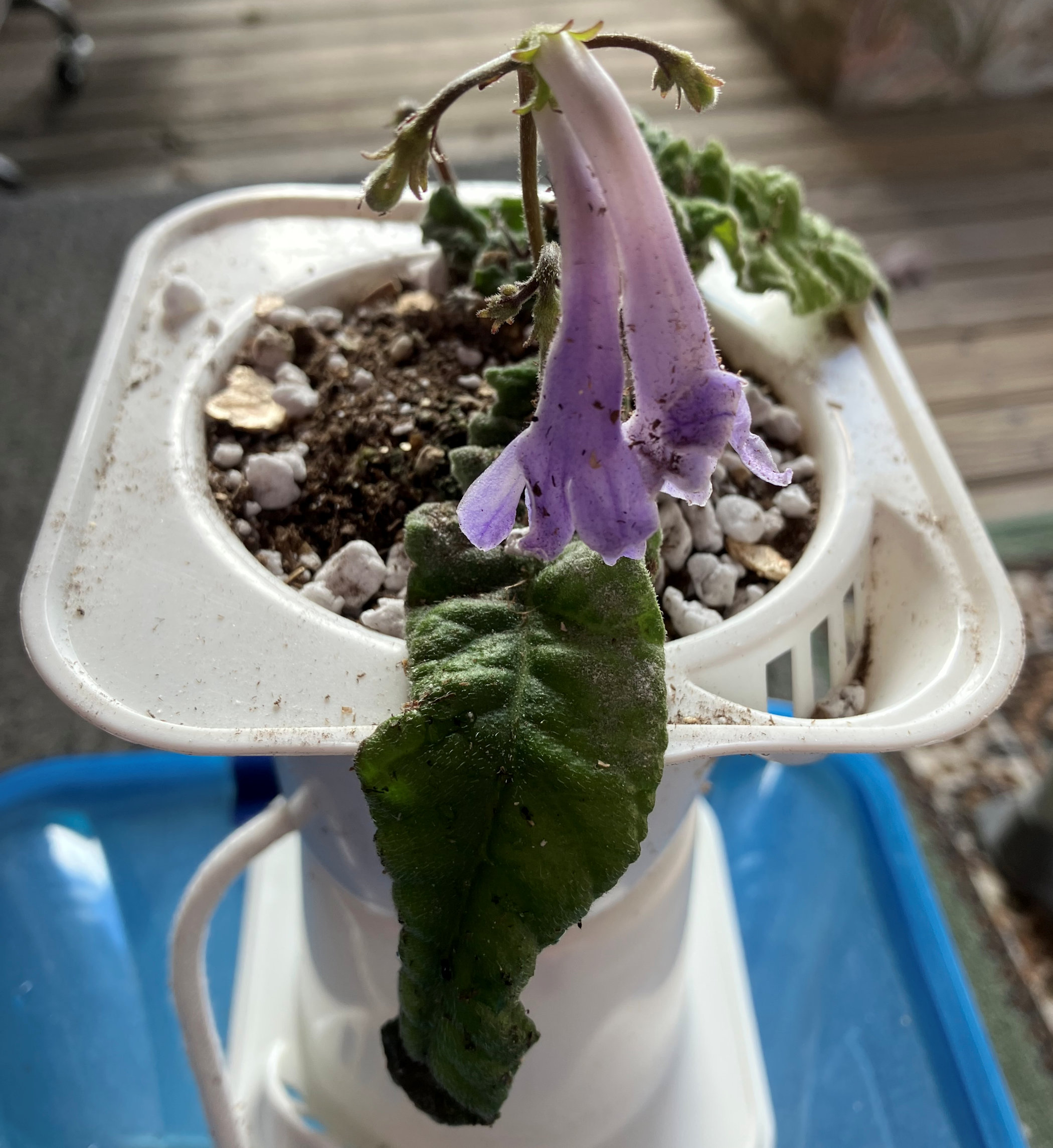 Le Viol Oct 11, 2025. Lovely, Glorinia looking flower. But seemed to be struggling in the Dandy pot, plus Dandy pot kept falling over, easily. Repotted into 3-inch-self-watering-plastic-pot.