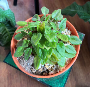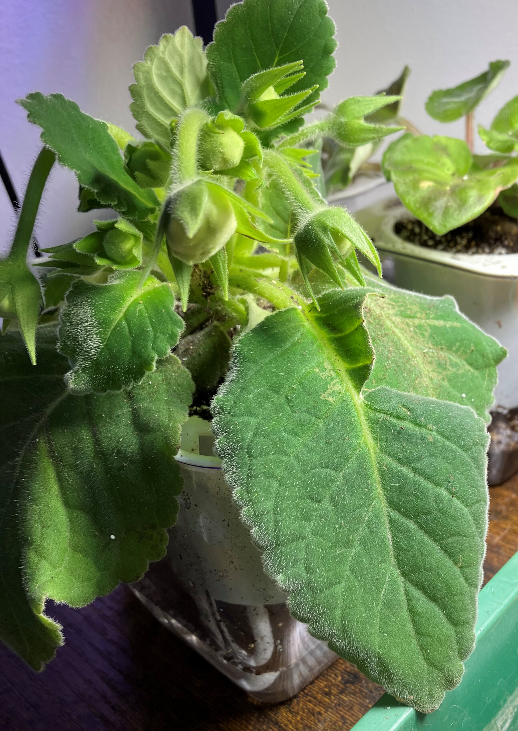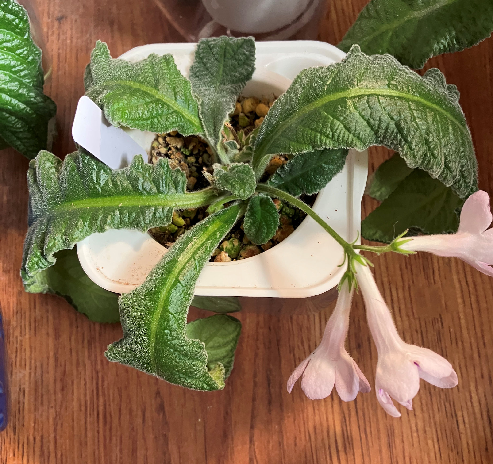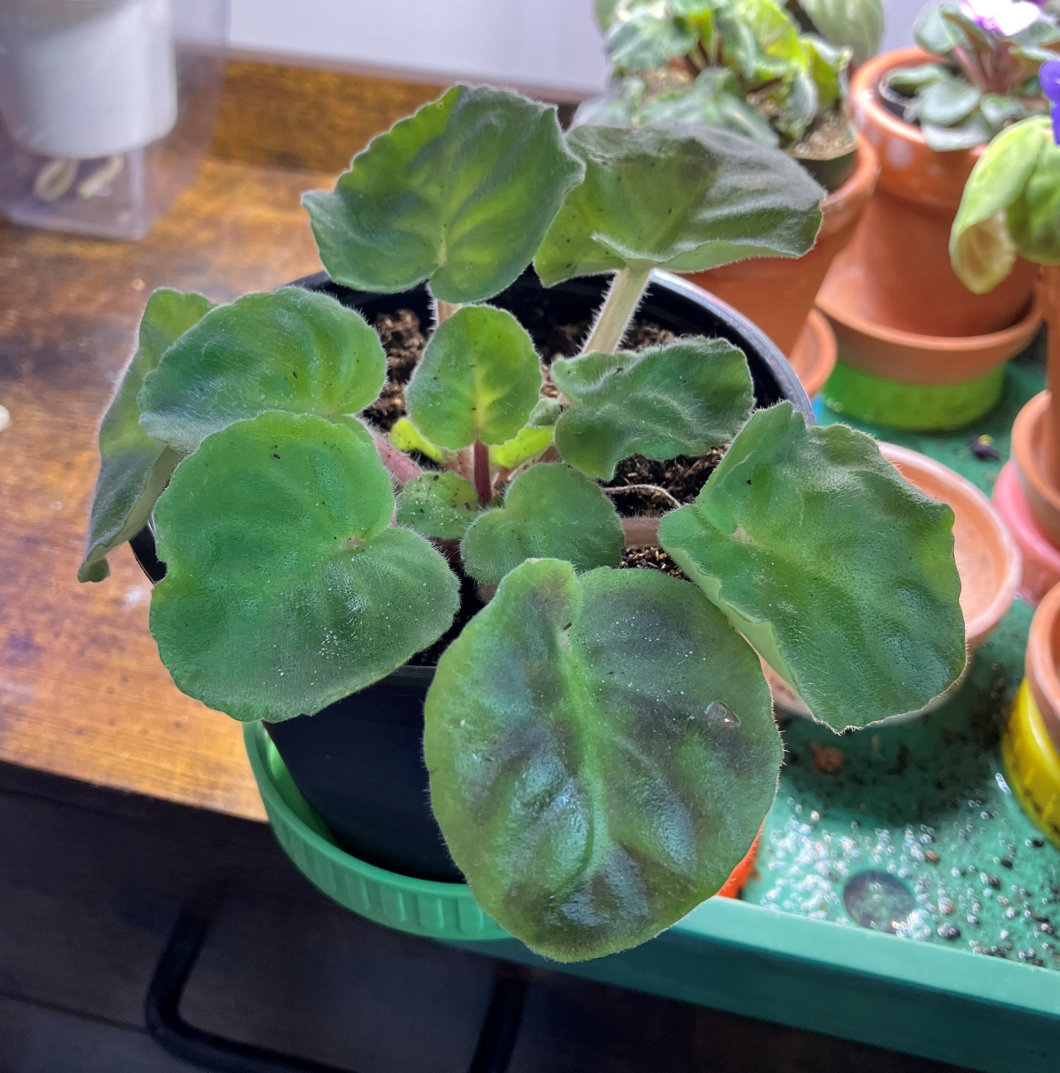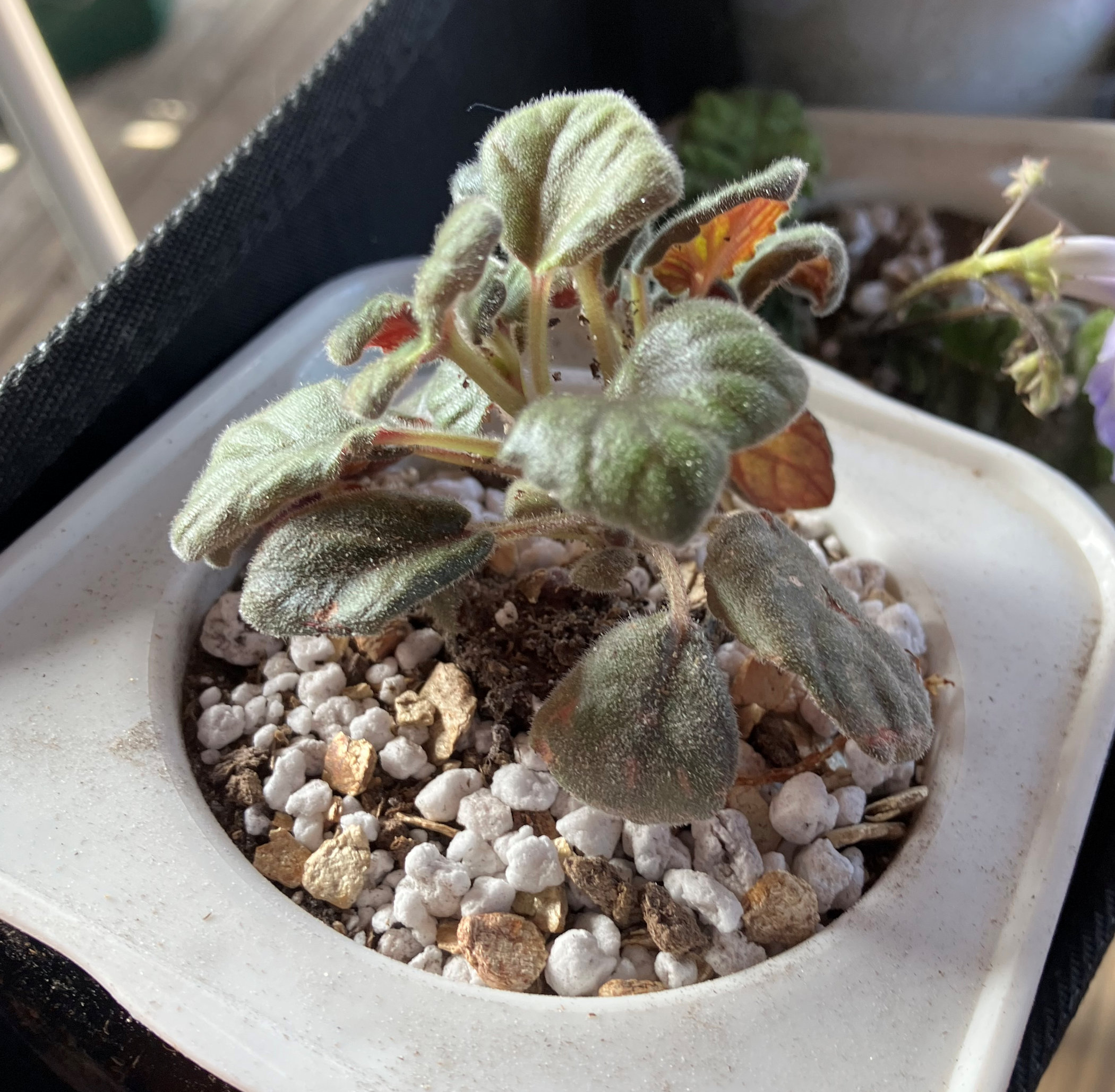 Sinningia Pirate’s Devil Sweet. Still a small plant. About to deflower for growth. Sept 1, 2025