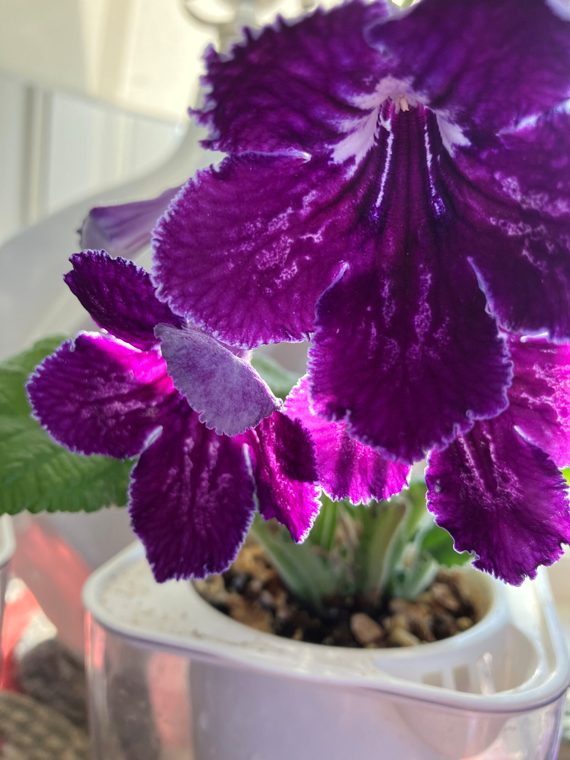 LE Violetta. Spectacular Streptocarpus, large, very dark purple, slightly fringed, blooms with large, bright white throat. Larger grower. Stunning! Purchased June 15, 2025 from The Violet Barn.