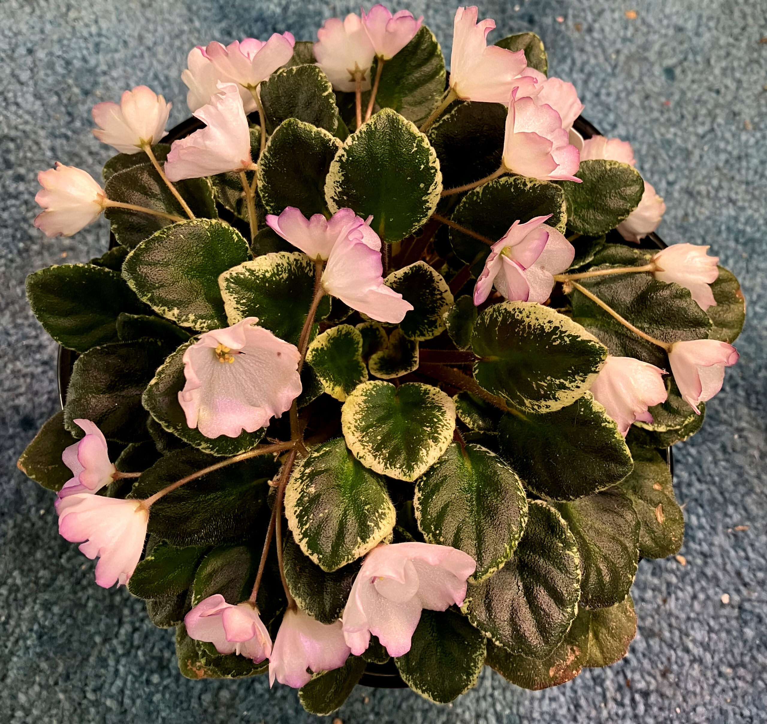 Cajuns Lil Forever Blue, mini AV. Single-semidouble dark blue star. Variegated medium green, cream and pink, plain, heart-shaped. Purchased Oct 23, 2024 from The Violet Barn.