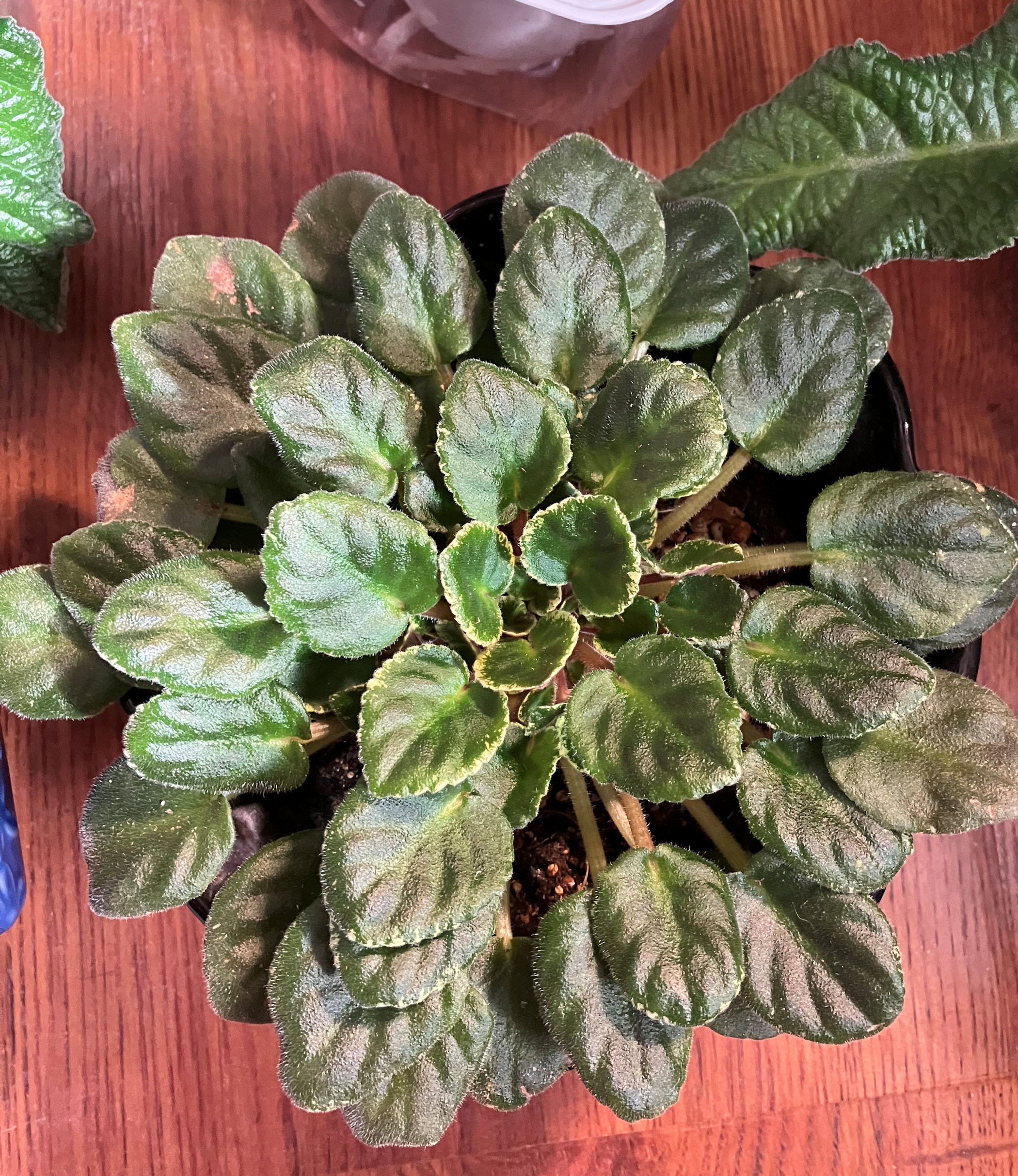 Rob’s Fuddy Duddy. Semi-mini AV. Semidouble dark mauve-purple sticktite pansy look. Dark green, quilted. Very profuse, very easy. Loads of deep orchid sdbl. pansies above perfect, dark foliage. Heavy and constant bloomer. Purchased June 15, 2025 from The Violet Barn. Seems a slow grower, buds are starting to show. Leaves are small and not-robust. Aug 25,2025.