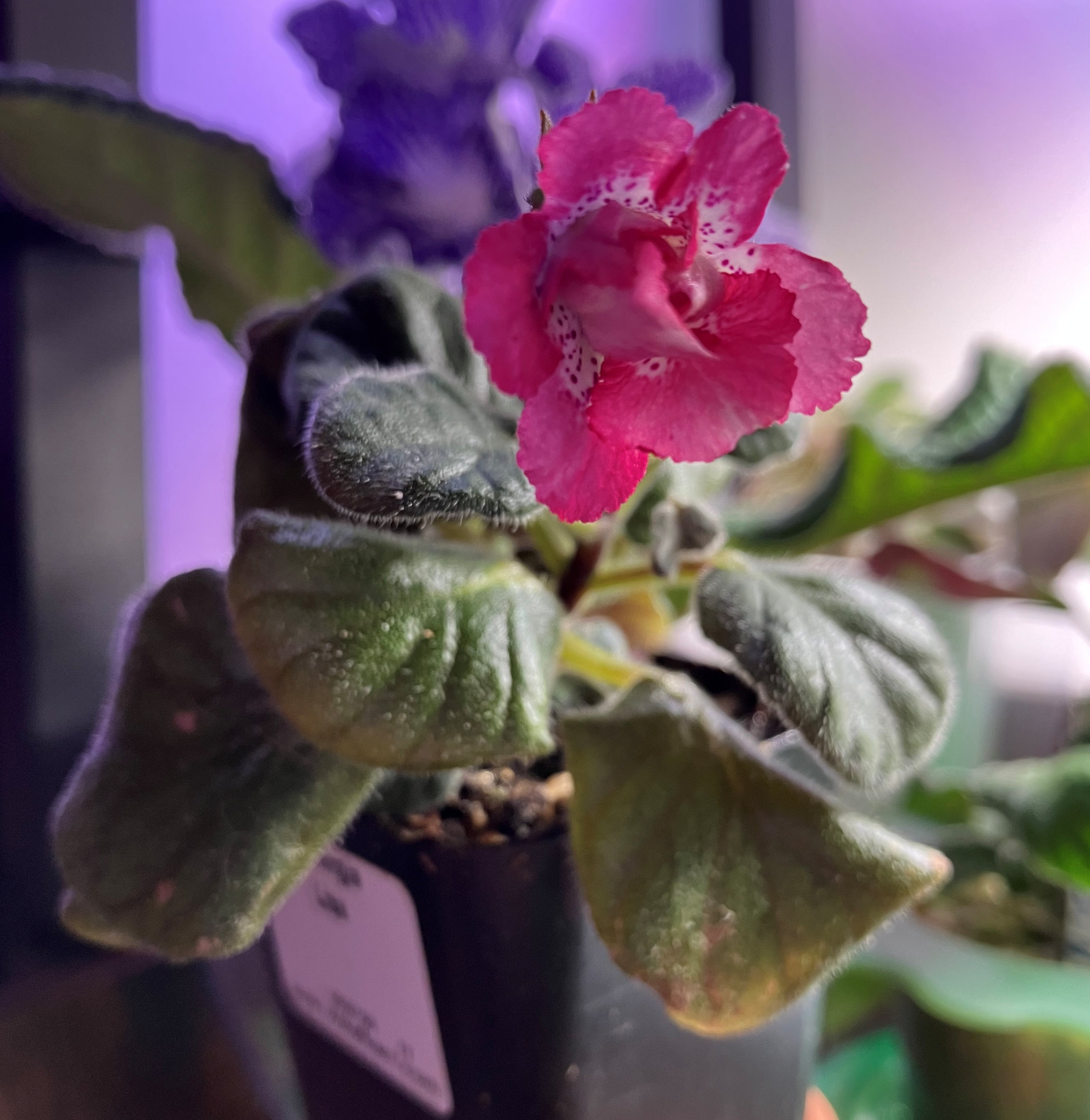 Sinningia Lisa, mini. Sdbl. red blooms with red dots on white throat and face. Purchased Aug 19, 2025 from The Violet Barn.