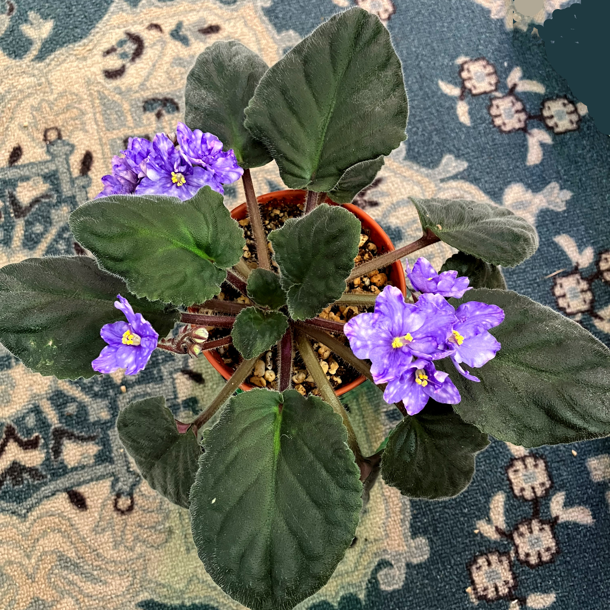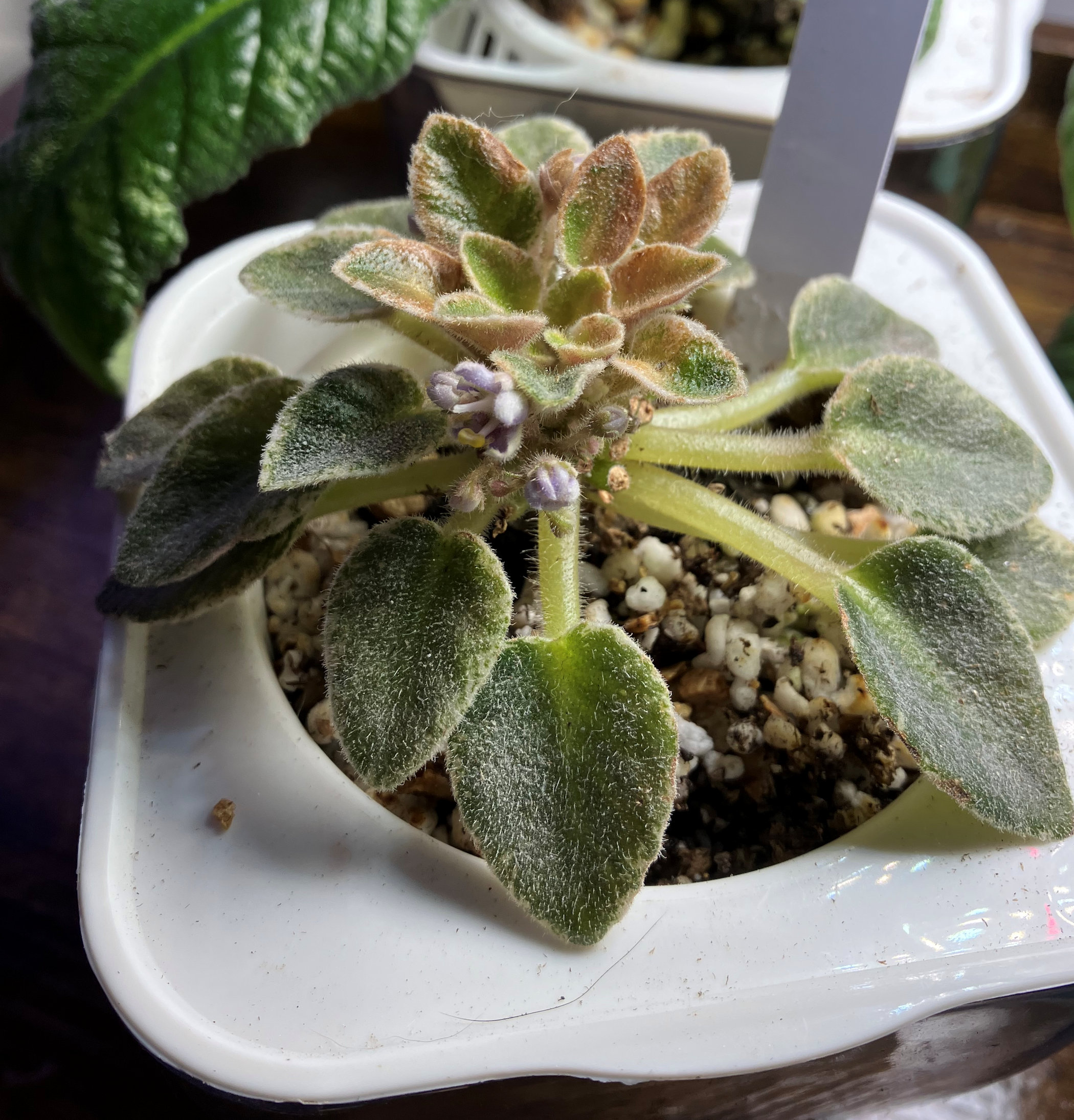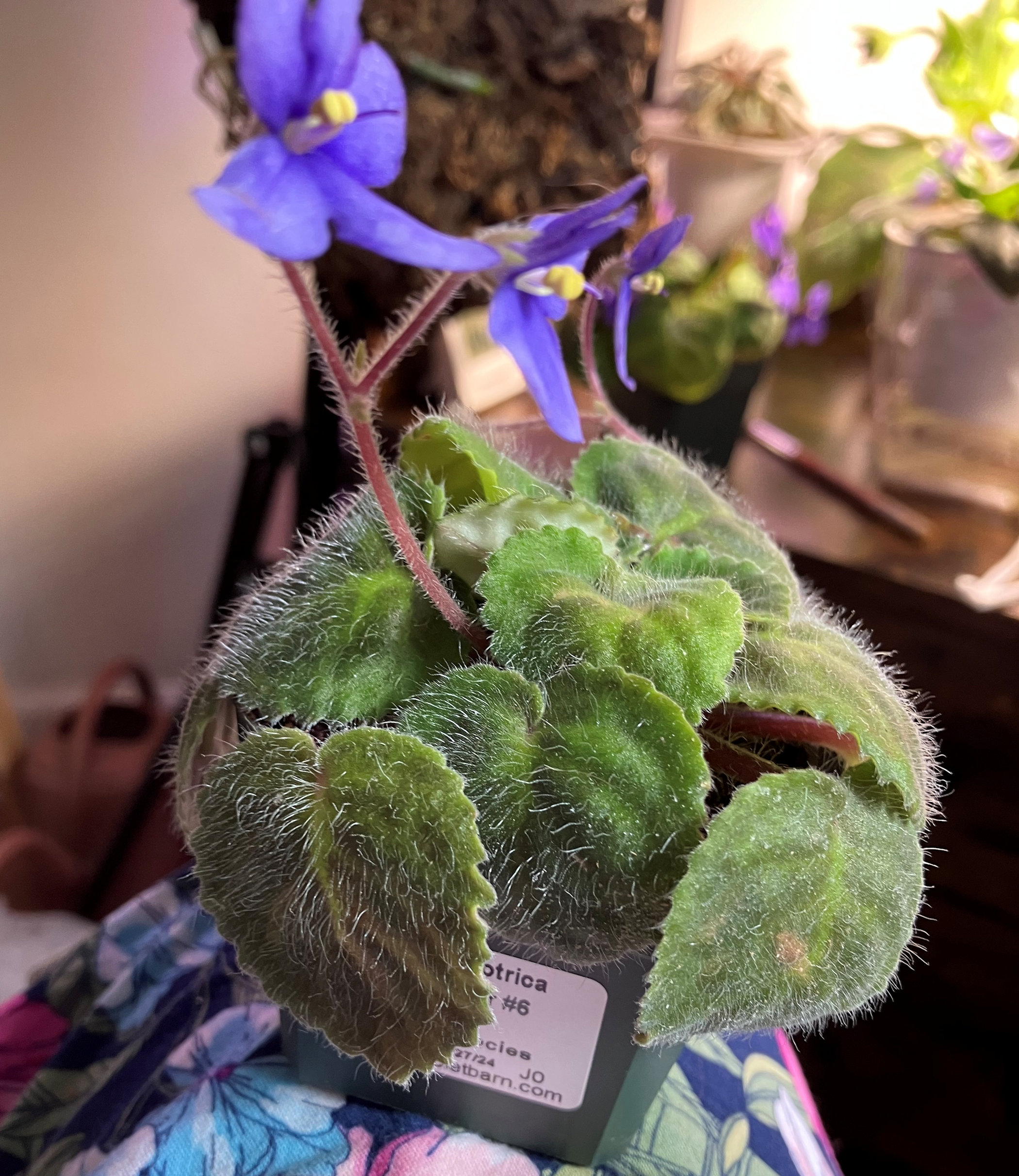 S diplotrichus punter #6. Single pale mauve to deep blue–purple blooms. Dark green, rounded, leaves with reddish petioles and backing with sharply toothed edges and erect hairs. Standard species. Not removing suckers. Does not like to be under strong LED lights will crimp leaves tight. Purchased June 22, 2025 from The Violet Barn.