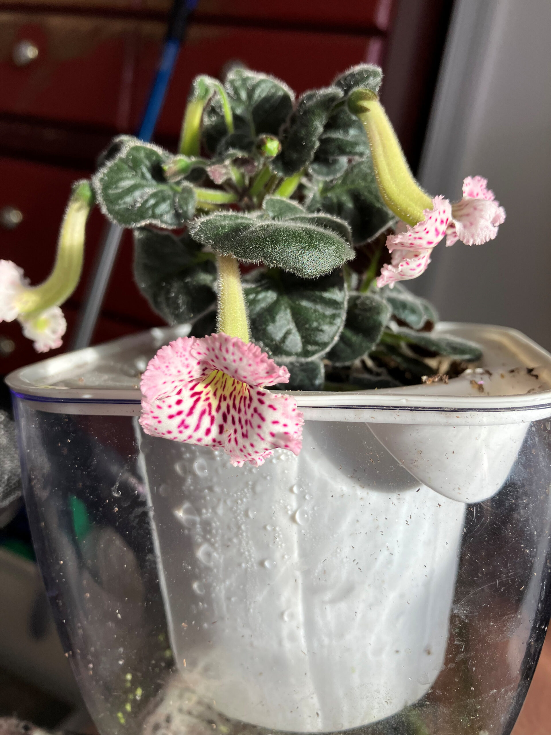 Sinningia Fu’s Lady Rain Lovely, mini. Fringed white to pastel pink blooms with yellowish throat and dark red-purple dots and dashes from throat throughout face. Purchased Aug 19, 2025 from The Violet Barn.