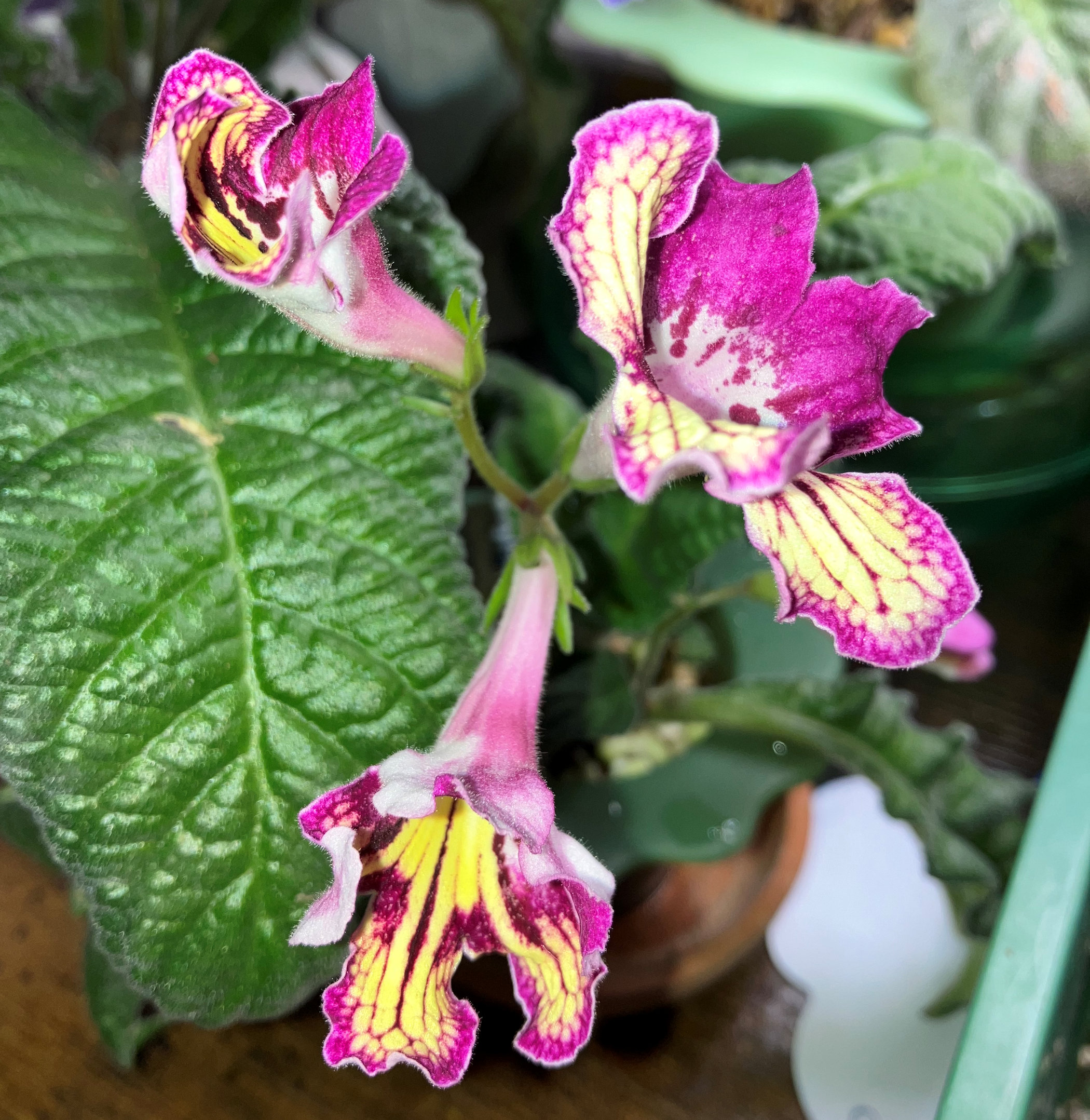 Salmon Sunset Streptocarpus. Large, deep pink with dark maroon streaks on large, bright yellow throat. Heavy bloomer, can be a spectacular plant. Purchased May 14, 2024 from The Violet Barn.