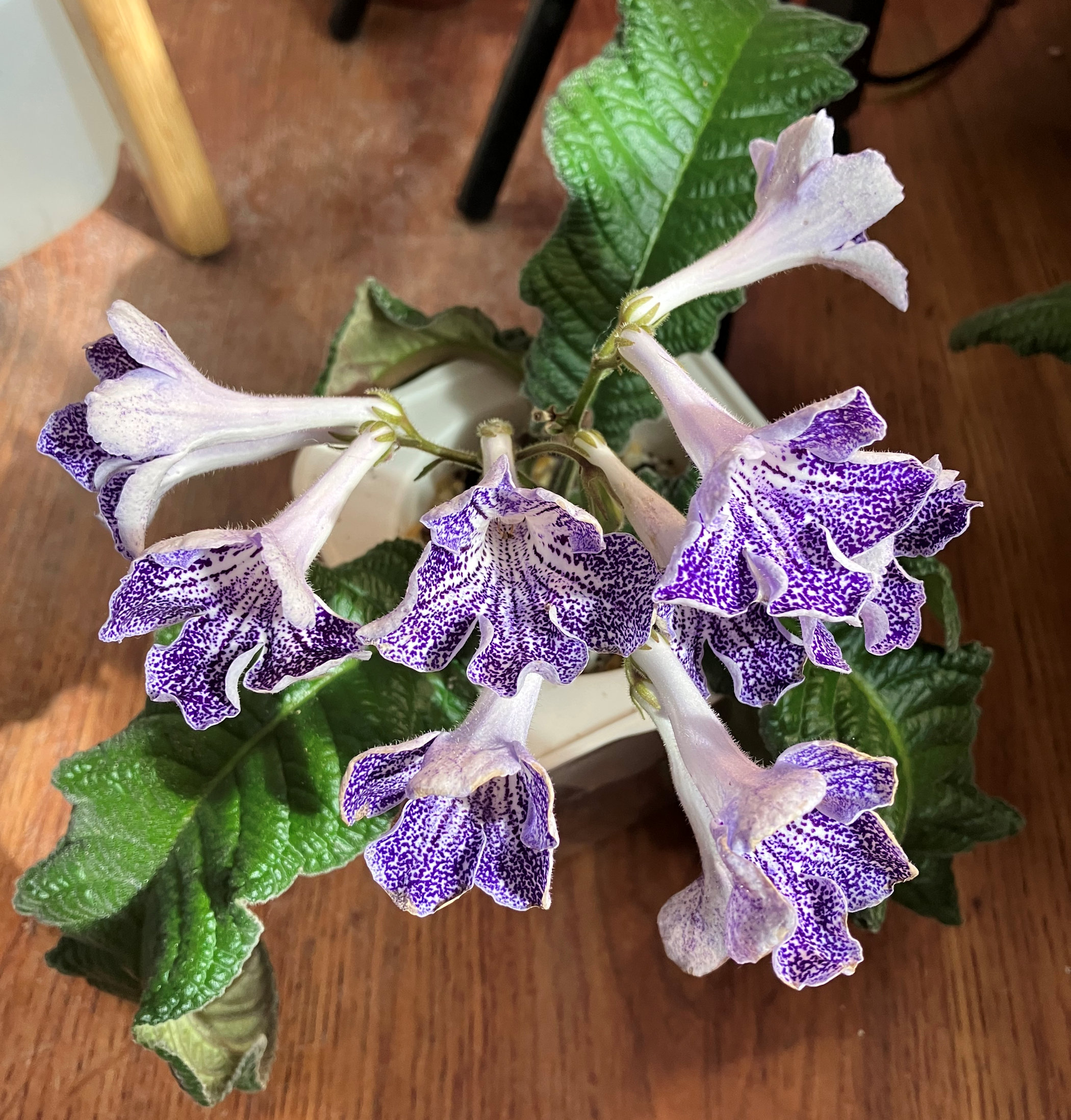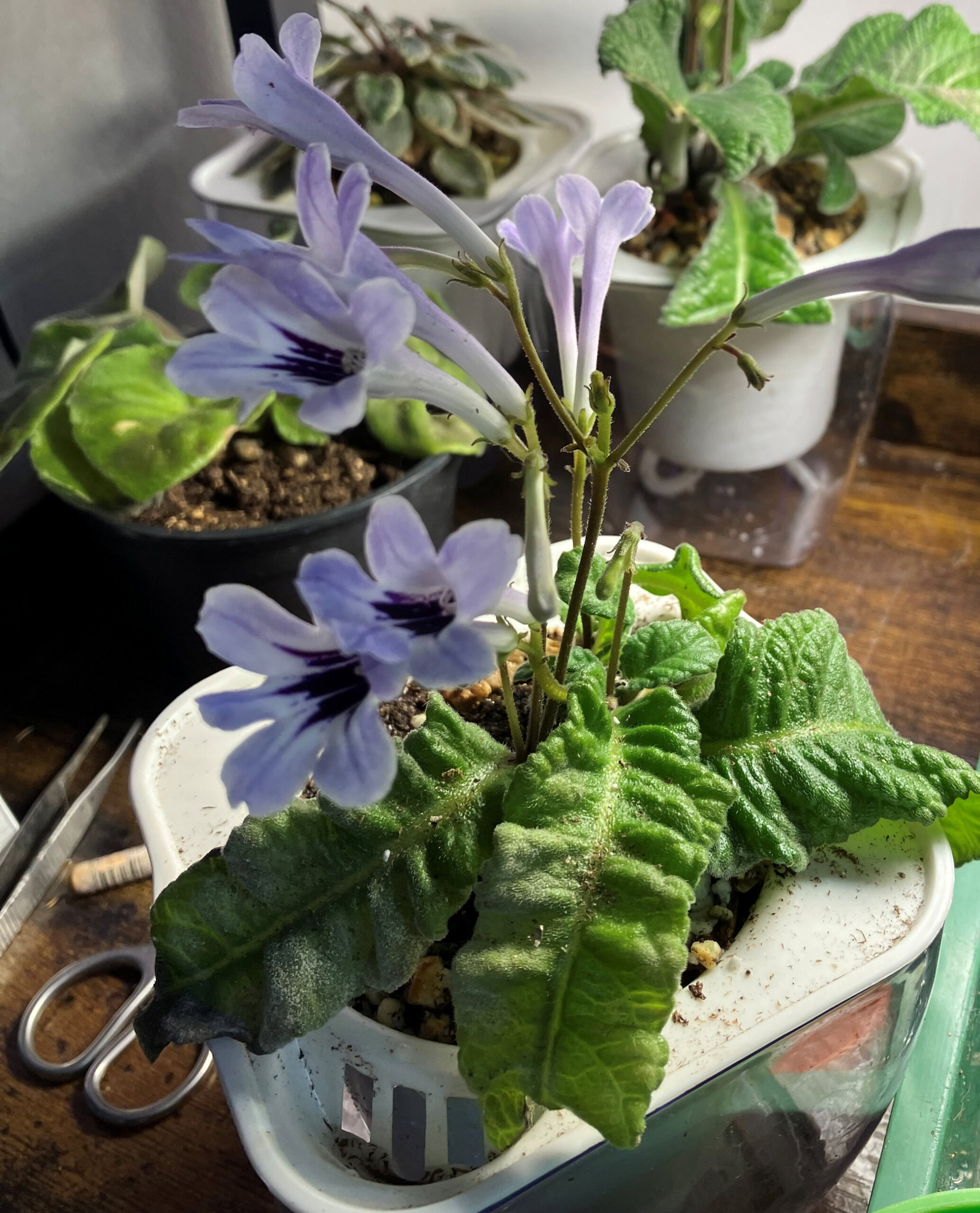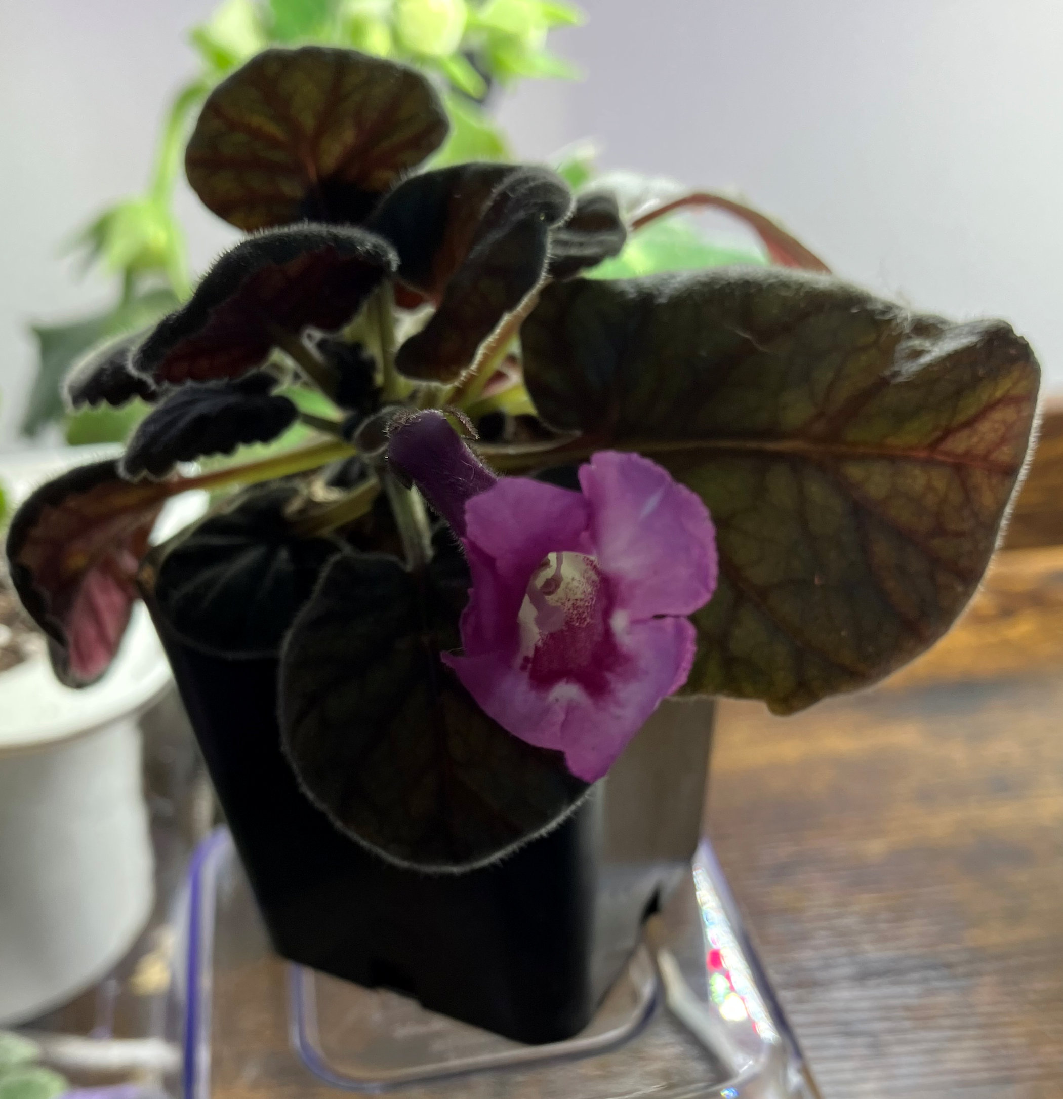 Sinningia Pirate’s Devil Sweet, Miniature. Medium lilac blooms with lighter lower lobes and dark purple throat. Medium dark foliage. Very striking Sinn. from Taiwan. Purchased Aug 19, 2025 from The Violet Barn.