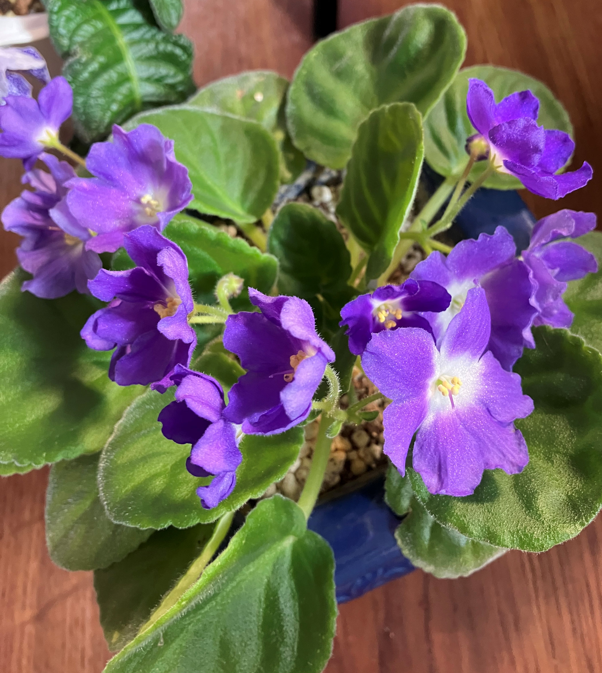 Bristol’s Nightfall: Stunning plant. Very dark blue blooms with thick black veining on bright yellow throat. Extremely heavy bloomer. Foliage will often show streaks and flecks of (sometimes heavy) variegation when young. Larger grower. Purchased June 22, 2025 from The Violet Barn.
