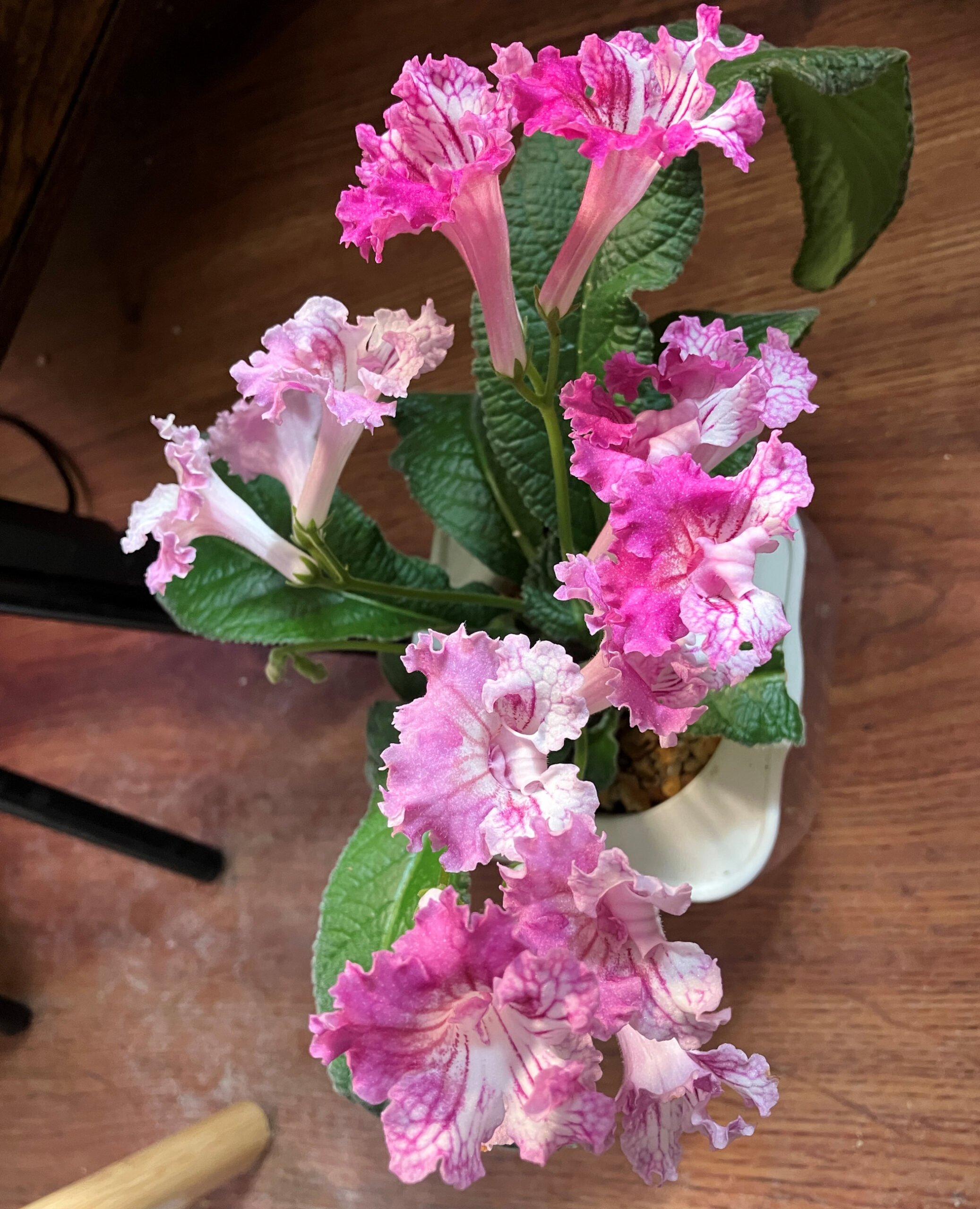 Bristol’s Peppermint, Streptocarpus. Sdbl. frilly peppermint-pink and white blooms. Flat, compact growing foliage. Easy grower and bloomer. Sdbl. mean Semi-double. These flowers have more than the standard five petals (which single flowers have) but less than a full second row of petals. Often, they have an extra crest or tuft of petals in the center that may not fully open. Purchased June 15, 2025 from The Violet Barn.