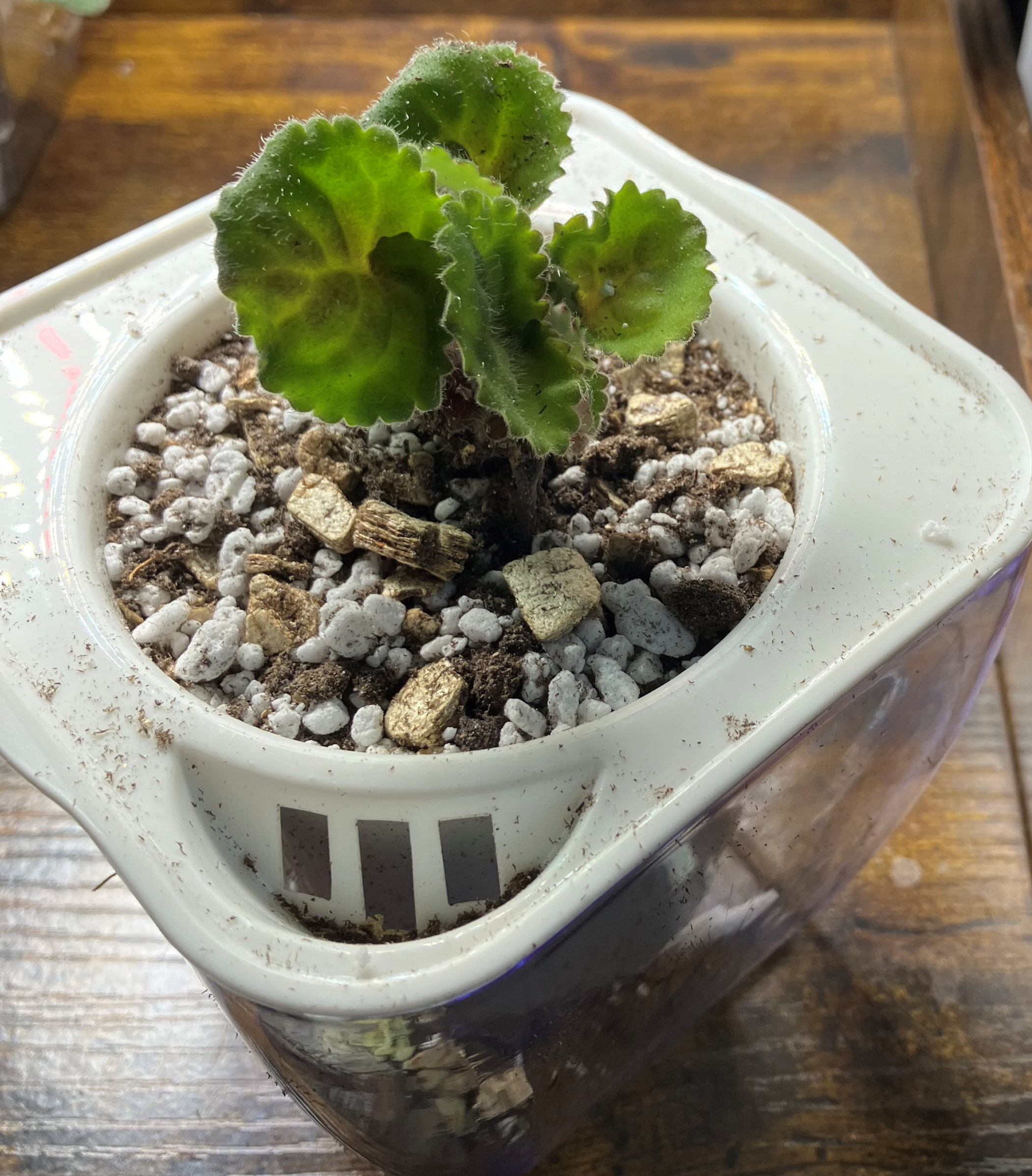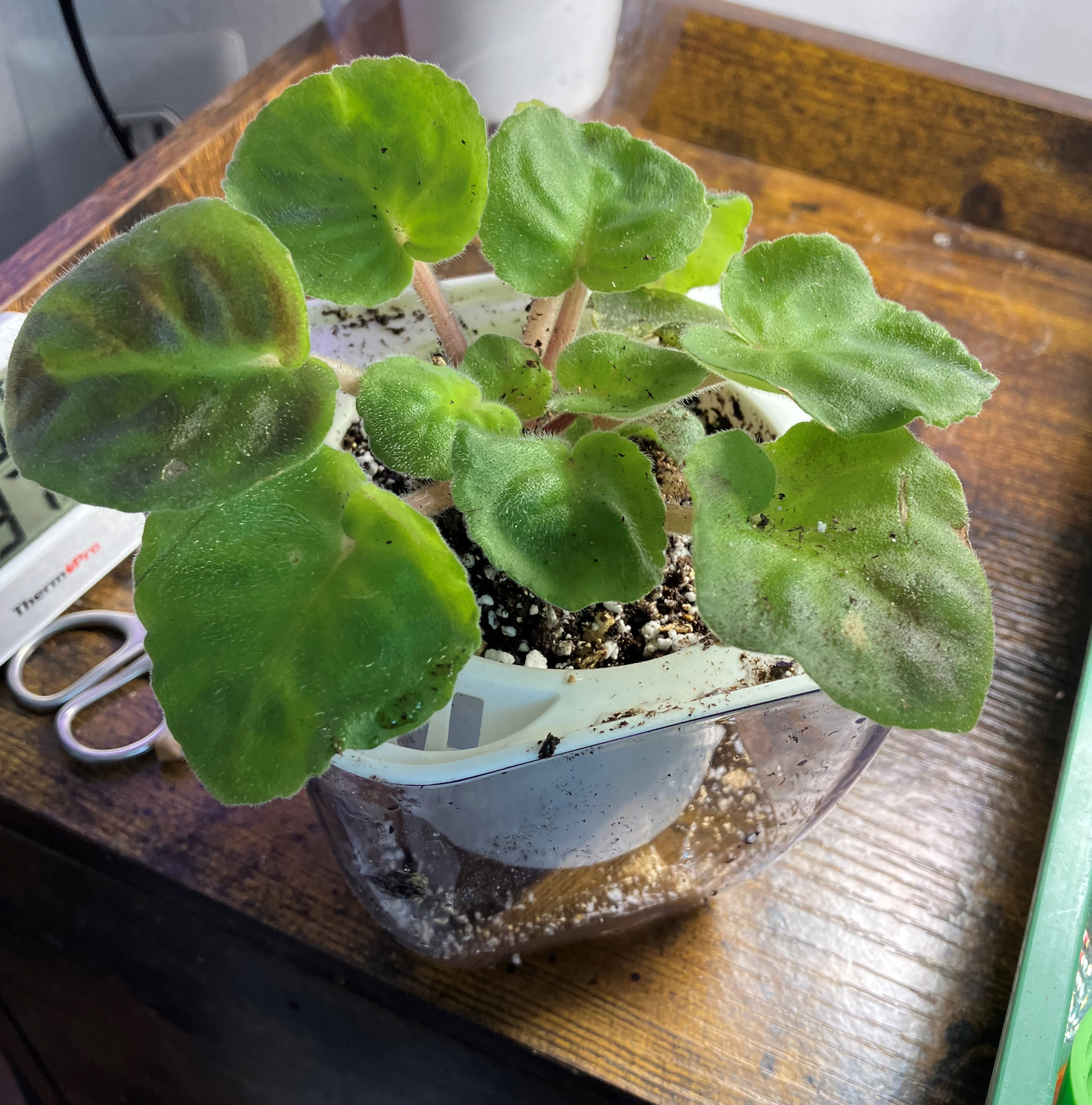 Bristol’s Indigo Eyes received June 25. Leafed 8/19/2024.Bristol’s Indigo Eyes repotted into 3-inch self watering plastic pot Aug 13, 2025.